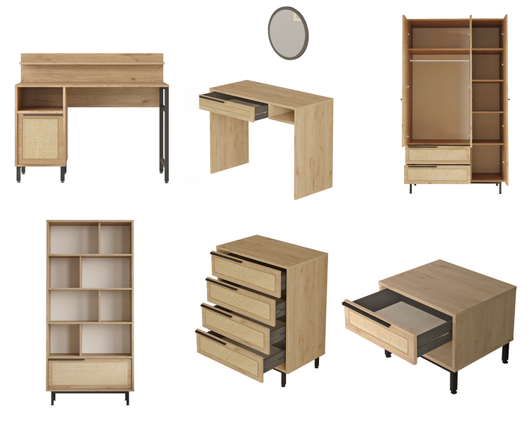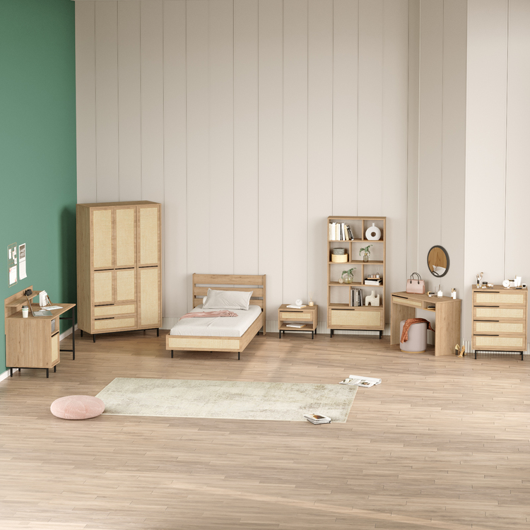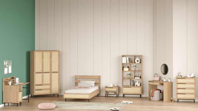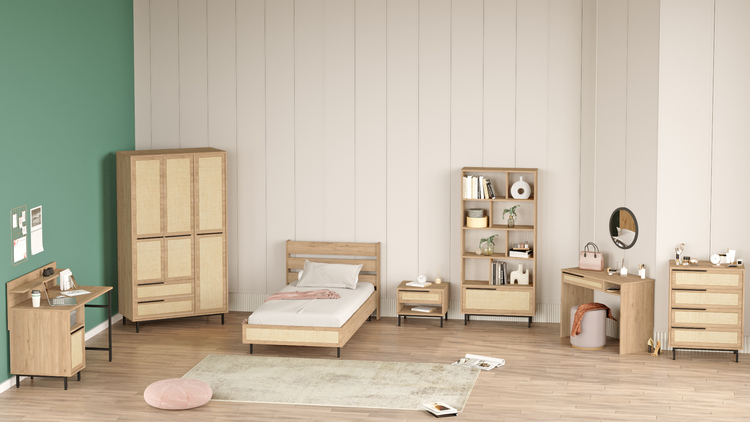 kombinuje pohodlí, praktičnost a styl. Postel nabízí komfortní místo pro spánek, noční stolek poskytuje prostor pro lampičku a knihy, šatní skříň zajistí dokonalou organizaci oblečení, psací stůl vytvoří ideální prostředí pro učení, knihovna nabídne prostor pro knihy a dekorace, a toaletní stolek dodává pokoji elegantní a praktický prvek pro osobní péči.