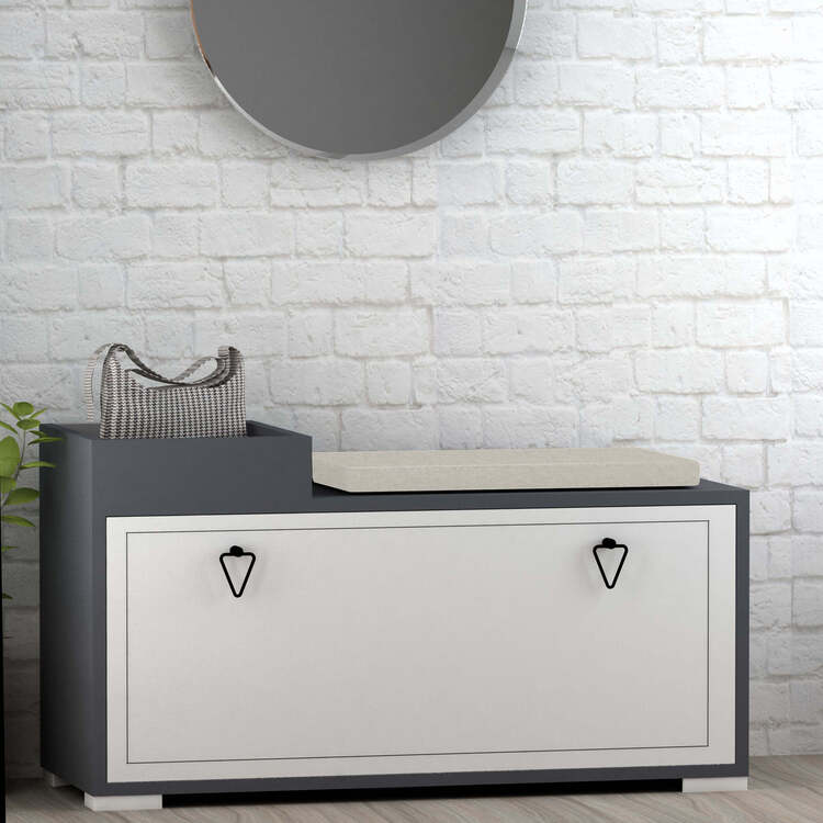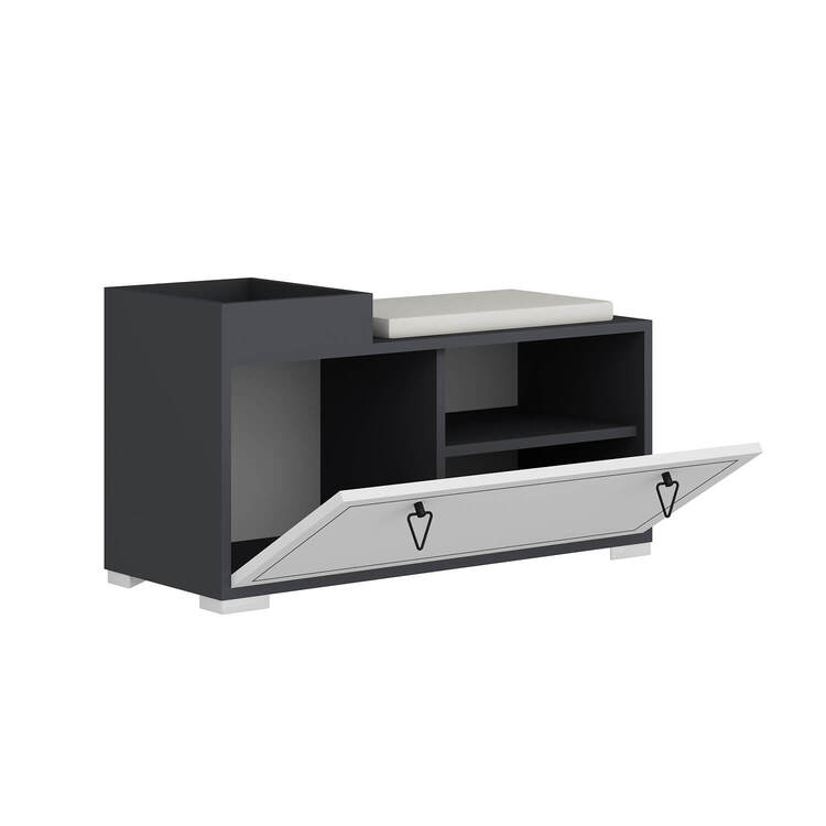 Botník je vyroben z kombinace kvalitního LTD materiálu a látky, což zajišťuje nejen pevnost, ale i pohodlí díky polštářku na sezení. Sedák není namontovaný na nábytku. Elegantní kovové úchytky a výklopné přihrádky přispívají k jeho modernímu vzhledu a funkčnosti. Dodáváme ho v demontu s plastovými nožičkami pro snadnou manipulaci a montáž.