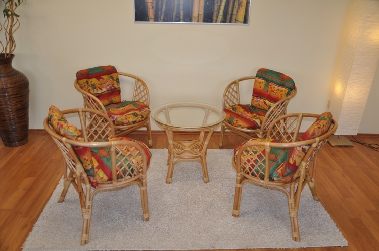 | Sedací souprava je vyrobena z přírodního ratanu.Barva ratanové konstrukce i výpletu je medová.Velikost křesla 67×65×72 cm.Nosnost křesla je 110 kg.Výška sedu křesla je 42 cm.Průměr skleněné desky stolku je 60 cm, výška stolku je 56 cm.Polstry jsou vyrobeny v Indonesii.