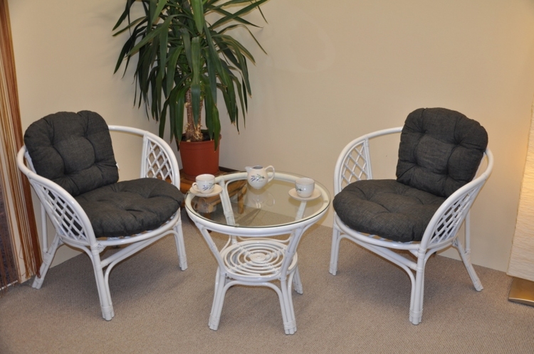 Ratanová sedací souprava je vyrobena z přírodního ratanu s barvou konstrukce odpovádající fotografii výrobku,obsahuje 2 křesla a stolek se sklem, kompletní sadu polstrů vyrobených v ČESKÉ REPUBLICE. | Barva ratanové konstrukce i výpletu je bílá.