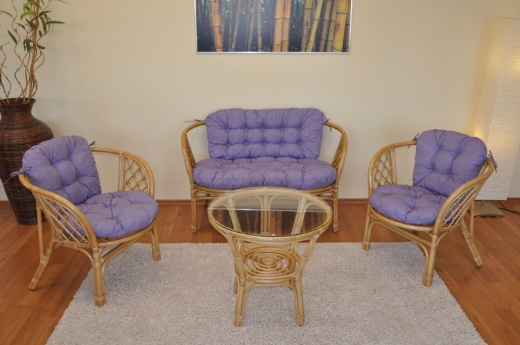 Ratanová sedací souprava Bahama medová velká polstry fialový melír