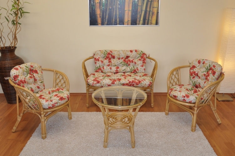 Ratanový nábytek – ratanová sedací souprava Bahama je vyrobena z přírodního ratanu s barvou konstrukce v medovém odstínu. Souprava obsahuje pohovku, 2 křesla, stolek se sklem a kompletní sadu polstrů vyrobených v České republice.| Barva ratanové konstrukce i ratanového výpletu je medová.Velikost pohovky je 115×66×73 cm, nosnost pohovky je 150 kg.Velikost křesla je 68×66×73 cm, nosnost křesla je 110 kg.Výška sedu je 44 cm.Stolek má výšku 55 cm, průměr stolku je 60 cm.Spoje ratanové konstrukce jsou šroubovány.Polstry na tuto sedací soupravu Bahama jsou vyrobeny v České republice. Polstry jsou vyrobeny z kvalitní látky a vyznačují se vysokou kvalitou zpracování.Polstry pro nás vyrábí firma AXIN Cuschions s.r.o., která zaměstnávávýhradně místní vyučené švadleny z České republiky. Tímto způsobem sesnažíme podporovat výrobu a zaměstnanost v naší republice.Náplň polstrů je drcený molitan a polstry lze prát ručně na 40o C.