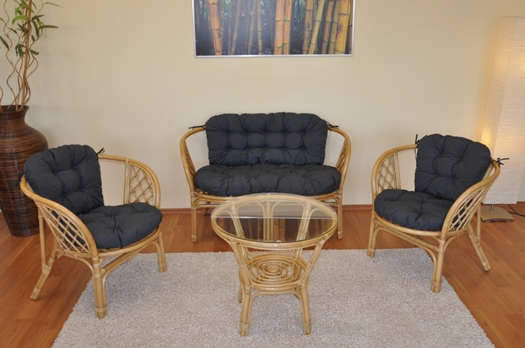 Ratanový nábytek – ratanová sedací souprava Bahama je vyrobena z přírodního ratanu s barvou konstrukce v medovém odstínu. Souprava obsahuje pohovku, 2 křesla, stolek se sklem a kompletní sadu velice kvalitních polstrů.