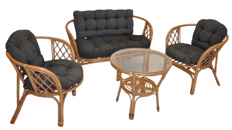 Ratanový nábytek – ratanová sedací souprava Bahama je vyrobena z přírodního ratanu s barvou konstrukce v tmavě medovém odstínu. Souprava obsahuje pohovku, 2 křesla, stolek se sklem a kompletní sadu polstrů.