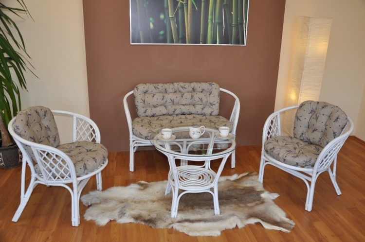 Ratanový nábytek – ratanová sedací souprava je vyrobena z přírodního ratanu s barvou konstrukce odpovádající fotografii výrobku,obsahuje lavici,2 křesla a stolek se sklem, kompletní sadu polstrů vyrobených v České republice. | Barva ratanové konstruk­ce je bílá.