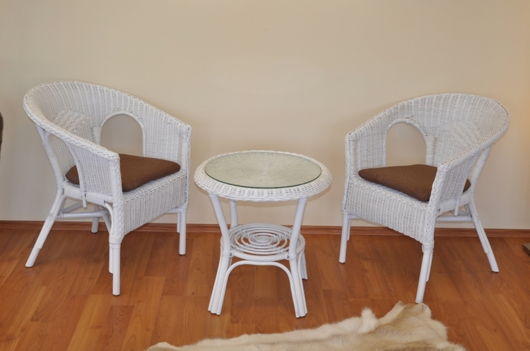 Ratanový nábytek – ratanová sedací souprava je vyrobena z přírodního ratanu v bílé barvě konstrukce. | Souprava obsahuje 2 křesla a stolek se sklem, kompletní sadu polstrů dle obrázkuMasivní ratanová konstrukce s ratanovým výpletem z proutků průměr 3 mm.Barva ratanové konstrukce i výpletu je bílá.Rozměr křesla je 58×57×76 cm, nosnost křesla 110 kgStolek se sklem průměr 50 cm, výška stolku je 55 cmPolstry jsou vyrobeny v České republice.Spoje ratanové konstrukce jsou šroubovány.
