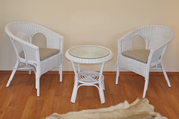 | Souprava obsahuje 2 křesla a stolek se sklem, kompletní sadu polstrů dle obrázkuMasivní ratanová konstrukce s ratanovým výpletem z proutků průměr 3 mm.Barva ratanové konstrukce i výpletu je bílá.Rozměr křesla je 58×57×76 cm, nosnost křesla 110 kgStolek se sklem průměr 50 cm, výška stolku je 55 cmPolstry jsou vyrobeny v České republice.Spoje ratanové konstrukce jsou šroubovány.