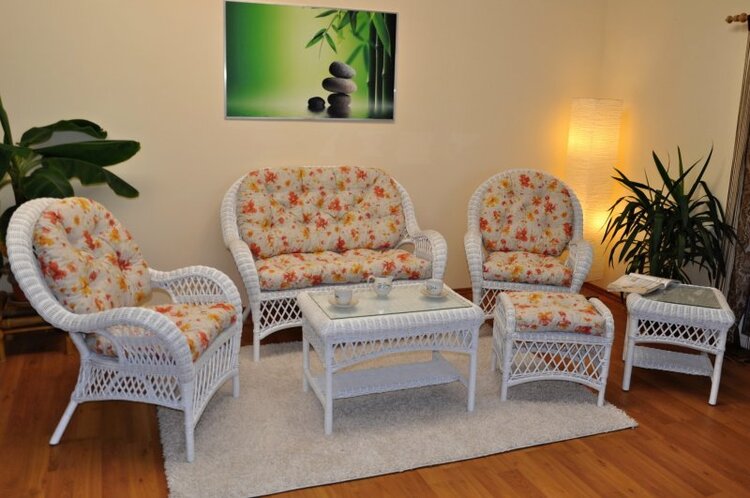 Nádherná ratanová sedací souprava vyrobená z přírodního ratanu s kostrou z masivních ratanový tyčí a výpletem z ratanových proutků. | Souprava je díky propracované a příjemně tvarované konstrukci velice pohodlná. Rozložitá křesla a pohovka poskytují příjemné posezení i díky širokým područkám.Barva ratanové konstrukce i ratanového výpletu je bílá.Velikost pohovky je 128×80×97 cm, výška sedu pohovky je 45 cm, nosnost pohovky je 200 kg.Velikost křesla Florida je 76×80×97 cm, nosnost křesla je 130 kg a výška sedu je 45 cm.Velikost ratanové taburetky Florida je 52×40×48 cm, výška sedu je 45 cm a nosnost 120 kg.Konferenční stolek Florida má velikost 80×50×50 cm a dodáváme ho včetně skleněné desky.Odkládací stolek Florida má velikost 52×52×50 cm a je také opatřen skleněnou deskou.Polstry z kvalitní potahové látky jsou vyrobeny v České republice.