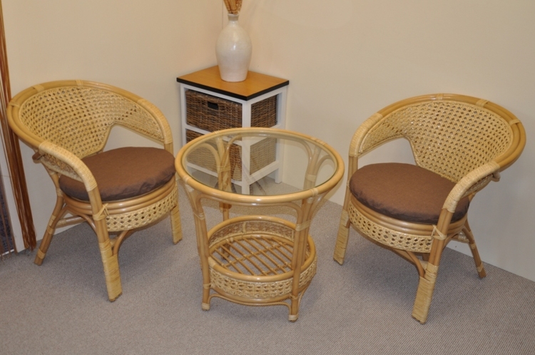 Ratanový nábytek – ratanová sedací souprava je vyrobena z přírodního ratanu s barvou konstrukce odpovádající fotografii výrobku,obsahuje 2 křesla a stolek se sklem a sadu polstrů.