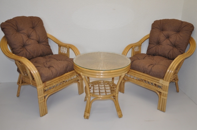 Ratanová sedací souprava je vyrobena z přírodního ratanu z masivních ratanových tyčí. Součástí soupravy jsou 2 křesla, stolek a sada polstrů. | Konstrukce ratanové sedací soupravy je na většině míst trojitá a tím velice pevná. Křesla jsou velice pohodlná díky rozložitému tvaru a kvalitním polštářům.Barva ratanové kontrukce a výpletu je medová.Velikost křesla je 68×75×74 cm, nosnost křesla je 125 kg.Výška sedu je 44 cm.Stolek má průměr 55 cm a je 55 cm vysoký.