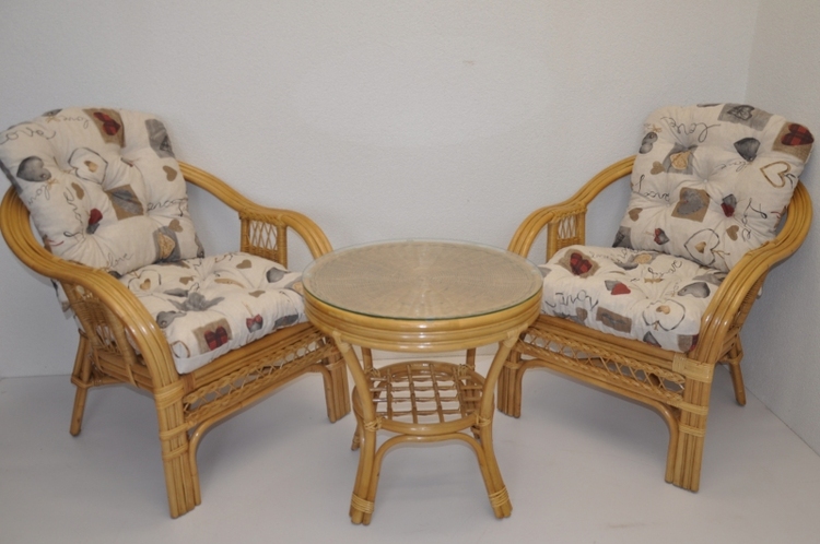 Ratanová sedací souprava je vyrobena z přírodního ratanu z masivních ratanových tyčí. Součástí soupravy jsou 2 křesla, stolek a sada polstrů. | Konstrukce ratanové sedací soupravy je na většině míst trojitá a tím velice pevná. Křesla jsou velice pohodlná díky rozložitému tvaru a kvalitním polštářům.Barva ratanové kontrukce a výpletu je medová.Velikost křesla je 68×75×74 cm, nosnost křesla je 125 kg.Výška sedu je 44 cm.Stolek má průměr 55 cm a je 55 cm vysoký.
