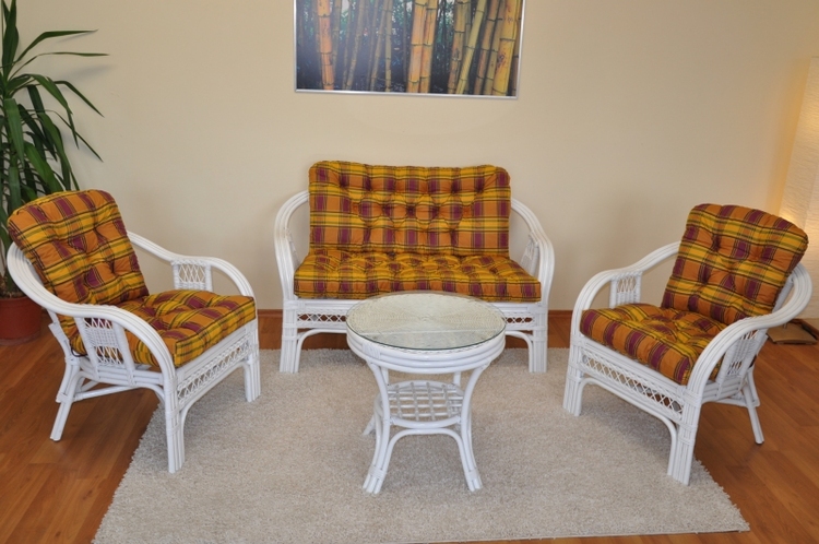 Ratanová sedací souprava je vyrobena z přírodního ratanu z masivních ratanových tyčí. Součástí soupravy je pohovka, 2 křesla, stolek a sada polstrů.