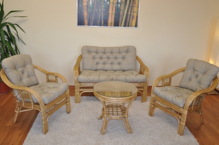 Ratanová sedací souprava je vyrobena z přírodního ratanu z masivních ratanových tyčí. Součástí soupravy je pohovka, 2 křesla, stolek a sada polstrů.