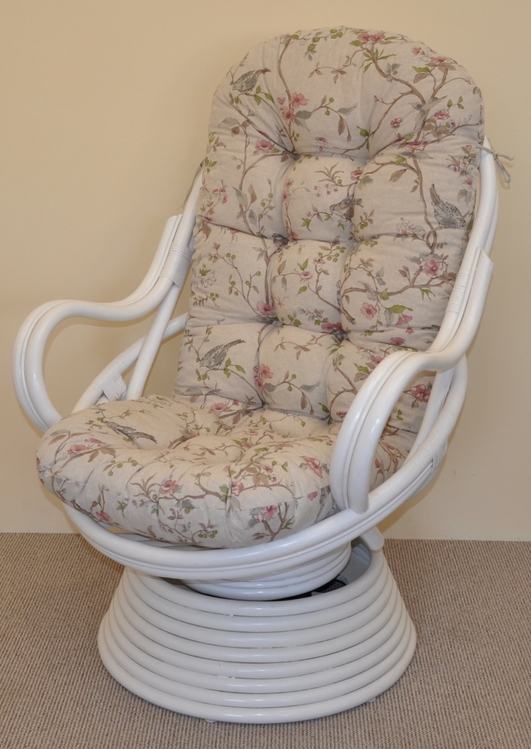 Ratanové houpací křeslo Swivel bílé polstr motiv ptáci