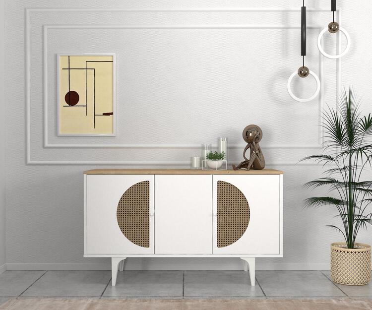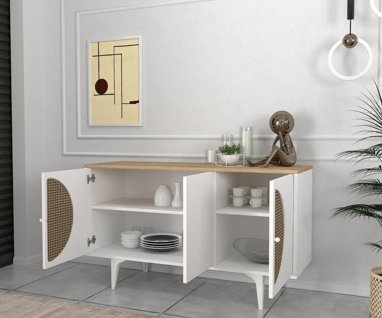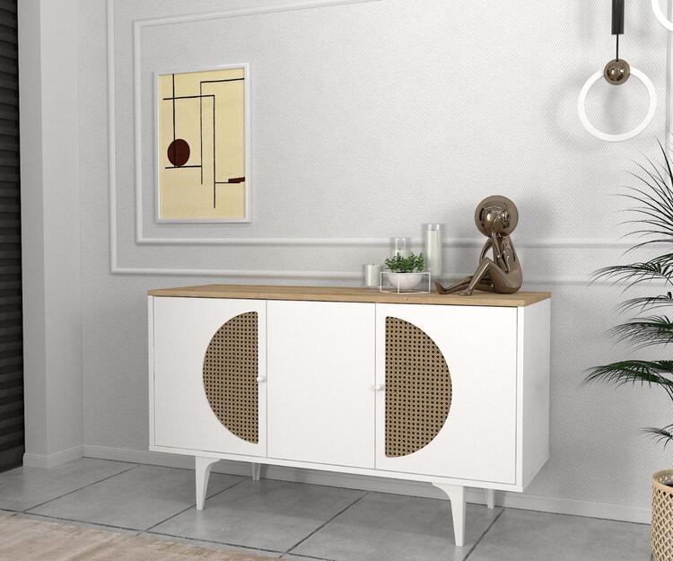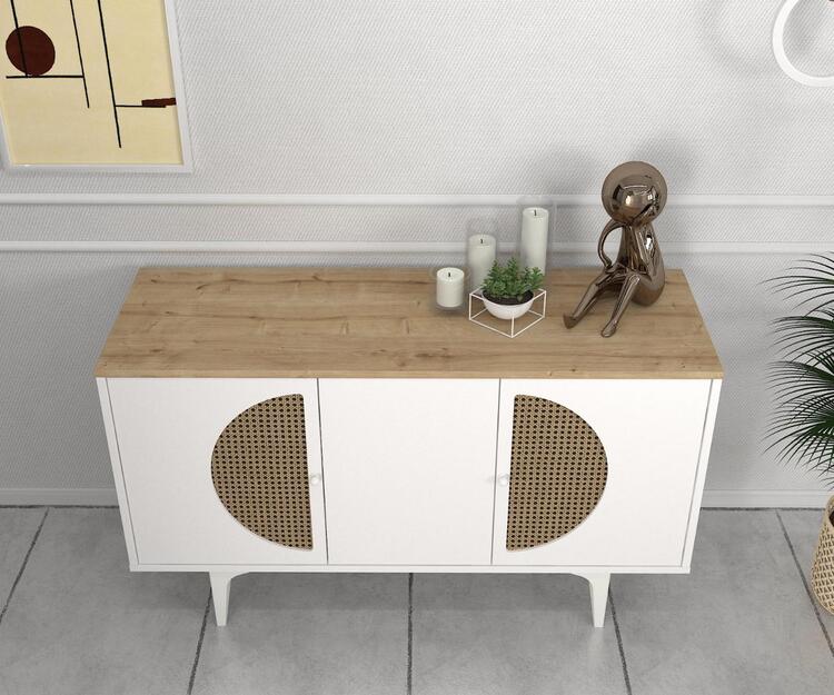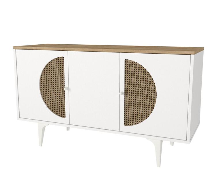 Komoda je skvělou volbou pro každého, kdo hledá funkční a estetické řešení pro svůj obývací pokoj. Vyrobená z kvalitního LTD materiálu s tloušťkou 18 mm, zajišťuje pevnost a dlouhou životnost. Kombinace bílé a světle hnědé barvy dodává komodě moderní a příjemný vzhled, který se hodí do jakéhokoli interiéru.