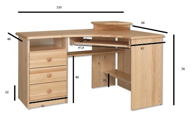 Pracovní rohový stůl, který je vyroben z kvalitního borovicového dřeva, které přinese do Vaší domácnosti tu správnou přírodní atmosféru a vůni dřeva. Základní borovicové dřevo je bez moření, můžete si však objednat i moření olše, dub, grey nebo ořech za 10% příplatek. Jednotlivé části nábytku tohoto výrobce lze různě kombinovat, čímž docílíte dokonalé harmonie a přitažlivého vzhledu Vašeho domova. Poněvadž má dřevo povrchovou úpravu proti škůdcům a vy budete mít zájem namořit si nábytek sami, napište do poznámek k objednávce – „Bez povrchové úpravy“. Vnitřní prostor zásuvek je hloubka 33 cm, šířka 31,5 cm a výška 12 cm.CASA 77001