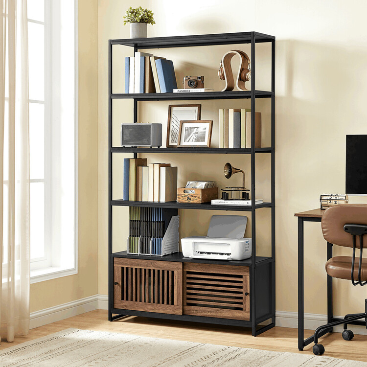Regál s rozměry 100×35×180 cm kombinuje pevný kovový rám v černé barvě s policemi z MDF desek v odstínu Old wood, které dodávají nábytku přírodní vzhled. Kovové nosné vzpěry zajišťují stabilitu a dlouhou životnost celé konstrukce. Čtyři otevřené police nabízejí dostatek prostoru pro vystavení dekorací nebo uložení knih, zatímco spodní část je vybavena uzavíratelnou skříňkou s posuvnými dvířky s dekorativním lamelovým vzorem. Design regálu je moderní a zároveň funkční, vhodný do obývacích pokojů, pracovních prostor i komerčních interiérů.