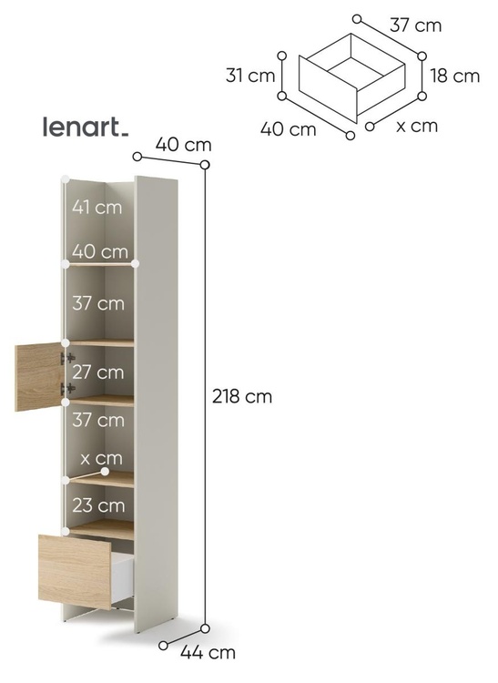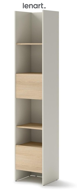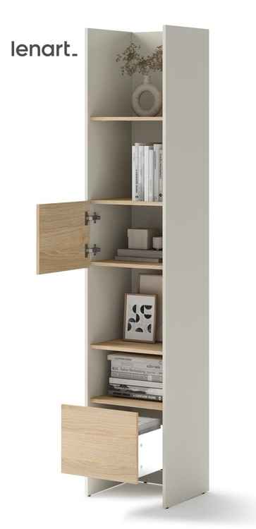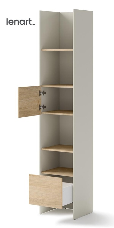 Regál s dvířky a zásuvkou kašmír/dub nagano. Rozměry viz obrázek. Nábytek je vyroben z kvalitního lamina s ABS hranou. Lamino je odolné proti poškrábání, poškození, vlhkosti a vysokým teplotám. Dodáváme v demontovaném stavu.CASA 73026