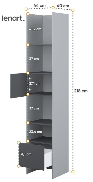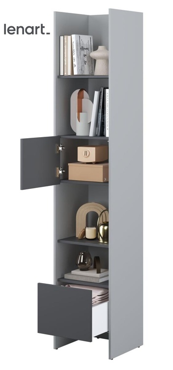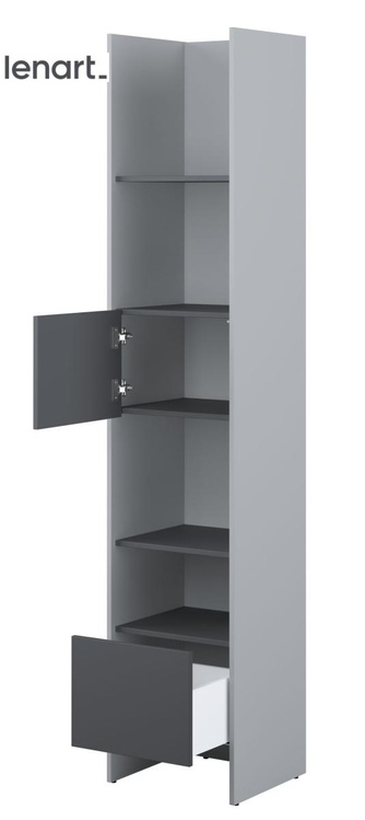 Regál s dvířky a zásuvkou šedá/grafit. Rozměry viz obrázek. Nábytek je vyroben z kvalitního lamina s ABS hranou. Lamino je odolné proti poškrábání, poškození, vlhkosti a vysokým teplotám. Dodáváme v demontovaném stavu.CASA 73026