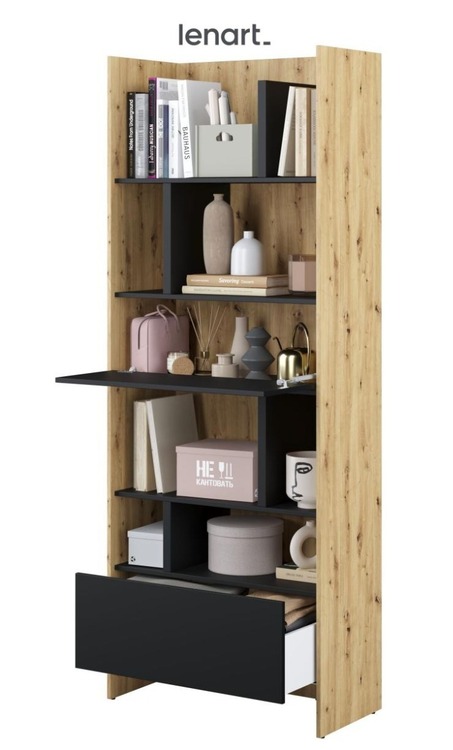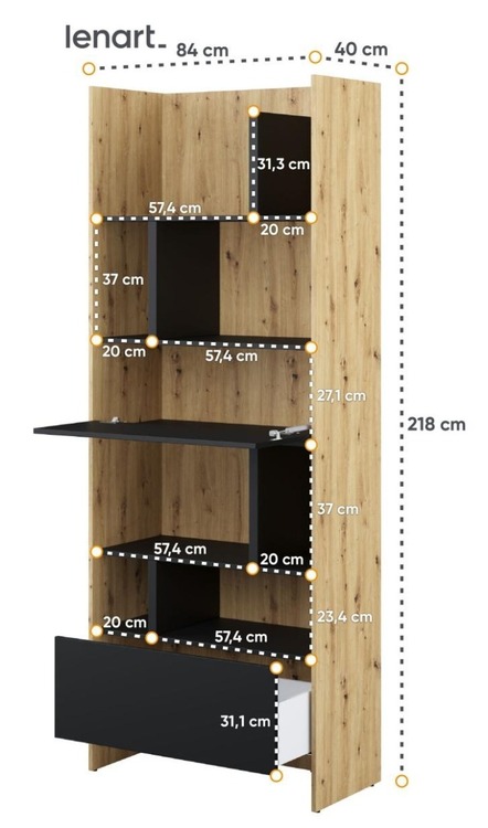Regál s výklopnými dvířky a zásuvkou dub artisan/černá. Rozměry viz obrázek. Nábytek je vyroben z kvalitního lamina s ABS hranou. Lamino je odolné proti poškrábání, poškození, vlhkosti a vysokým teplotám. Dodáváme v demontovaném stavu.CASA 73026