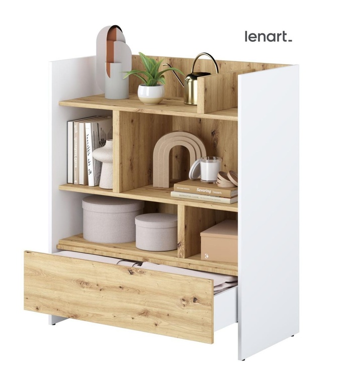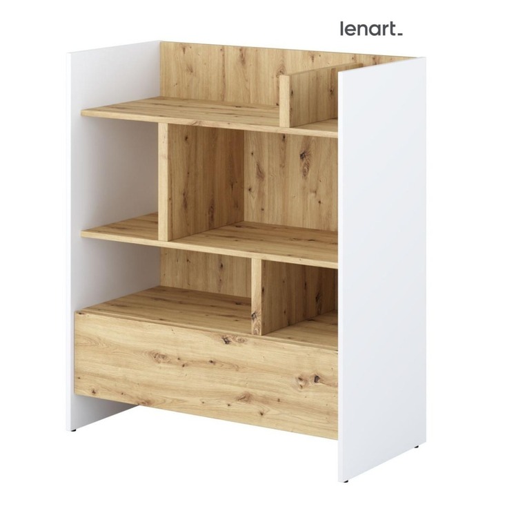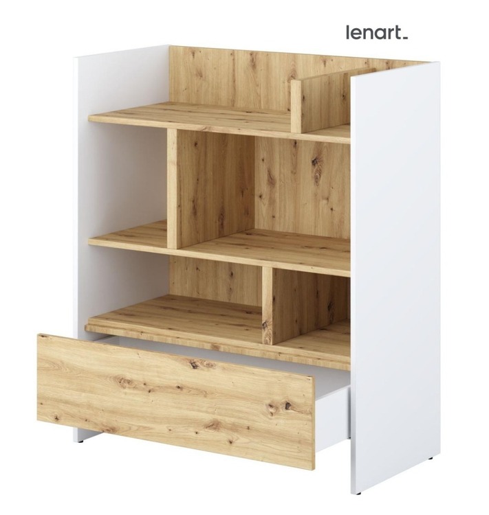 Regál se zásuvkou bílá/dub artisan. Rozměry viz obrázek. Nábytek je vyroben z kvalitního lamina s ABS hranou. Lamino je odolné proti poškrábání, poškození, vlhkosti a vysokým teplotám. Dodáváme v demontovaném stavu.CASA 73026