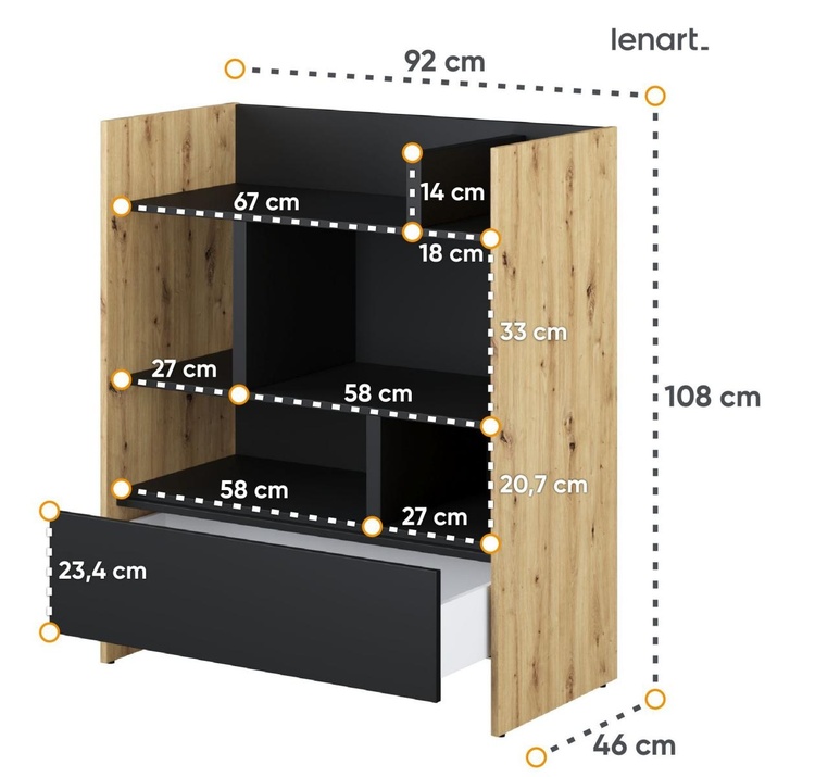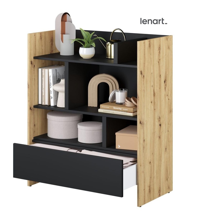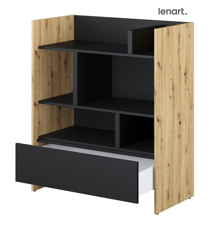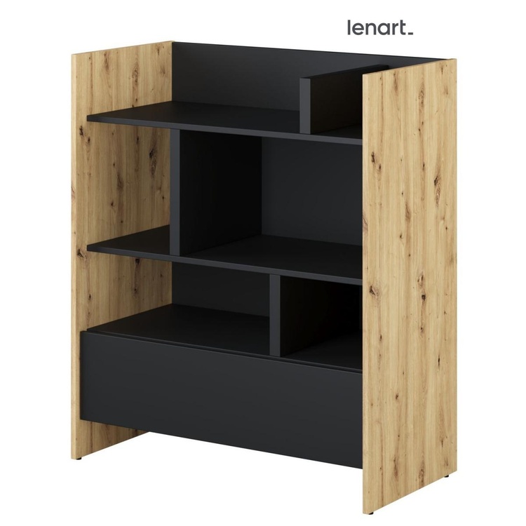 Regál se zásuvkou dub artisan/černá. Rozměry viz obrázek. Nábytek je vyroben z kvalitního lamina s ABS hranou. Lamino je odolné proti poškrábání, poškození, vlhkosti a vysokým teplotám. Dodáváme v demontovaném stavu.CASA 73026