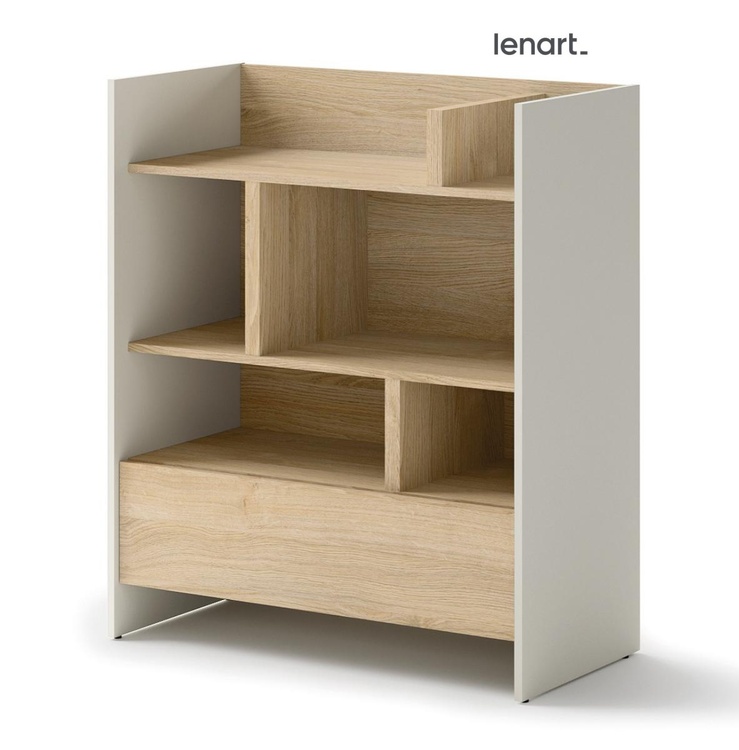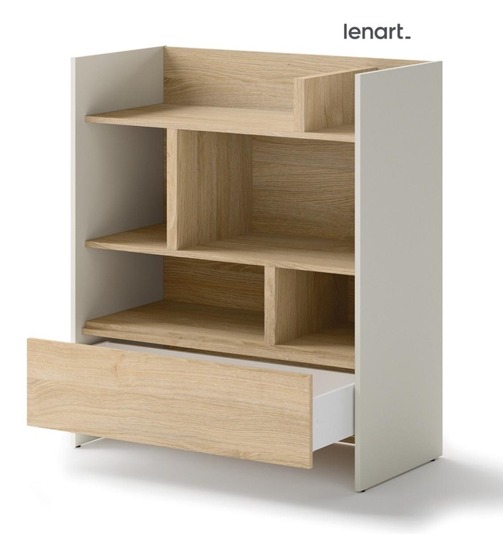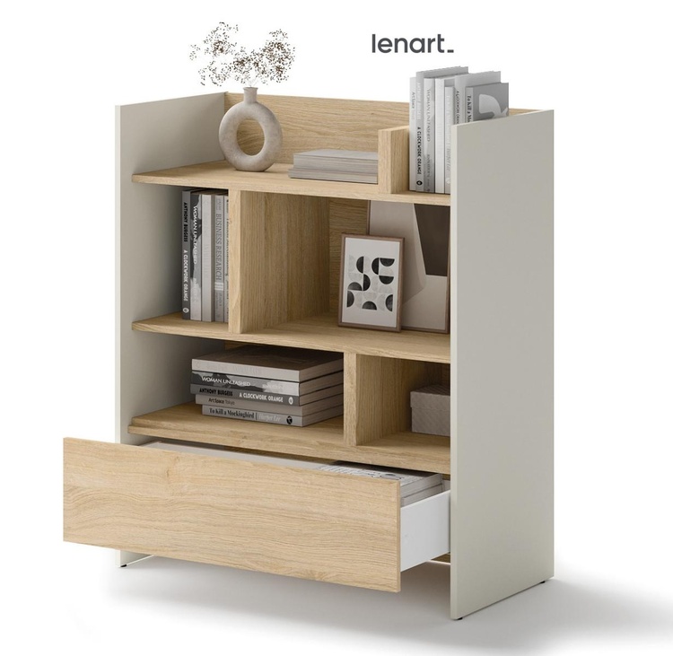 Regál se zásuvkou kašmír/dub nagano. Rozměry viz obrázek. Nábytek je vyroben z kvalitního lamina s ABS hranou. Lamino je odolné proti poškrábání, poškození, vlhkosti a vysokým teplotám. Dodáváme v demontovaném stavu.CASA 73026
