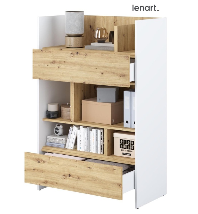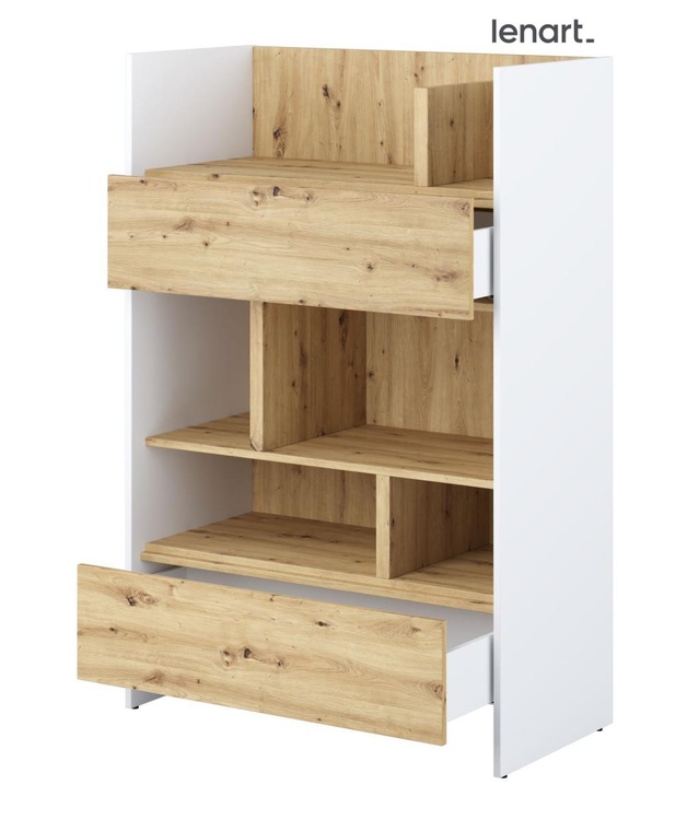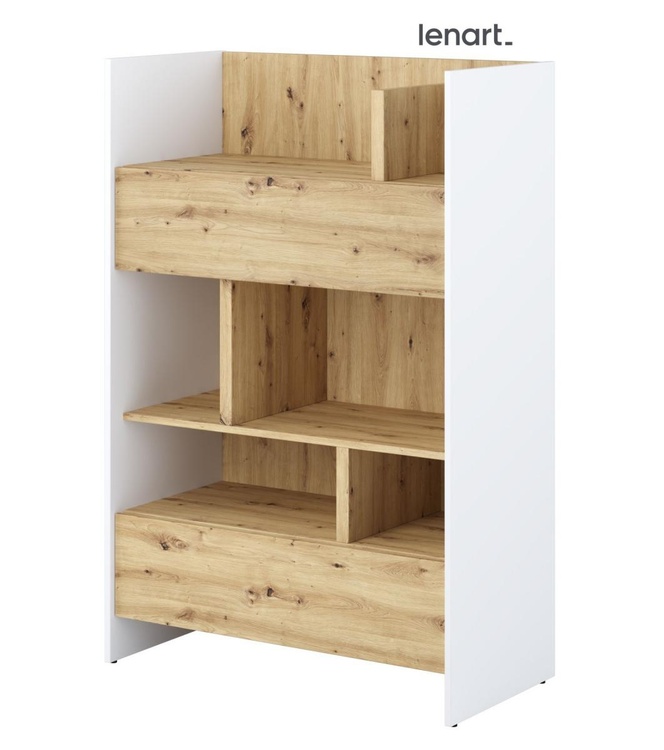 Regál se dvěma zásuvkami bílá/dub artisan. Rozměry viz obrázek. Nábytek je vyroben z kvalitního lamina s ABS hranou. Lamino je odolné proti poškrábání, poškození, vlhkosti a vysokým teplotám. Dodáváme v demontovaném stavu.CASA 73026