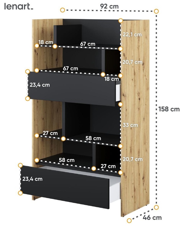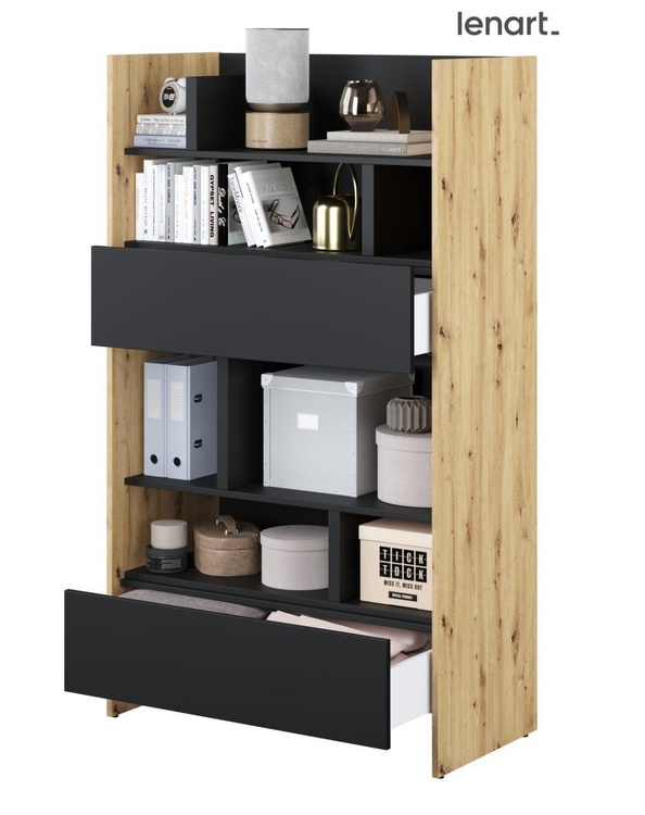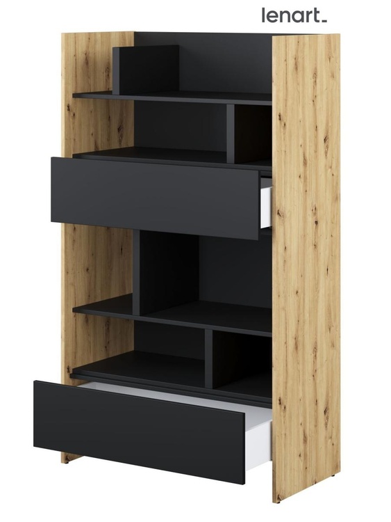 Regál se dvěma zásuvkami dub artisan/černá. Rozměry viz obrázek. Nábytek je vyroben z kvalitního lamina s ABS hranou. Lamino je odolné proti poškrábání, poškození, vlhkosti a vysokým teplotám. Dodáváme v demontovaném stavu.CASA 73026