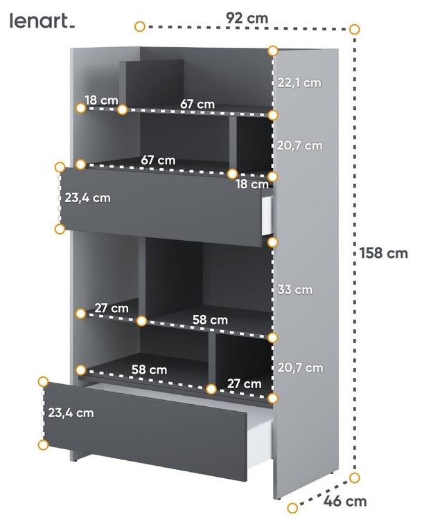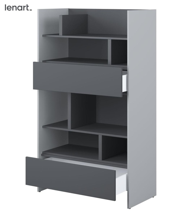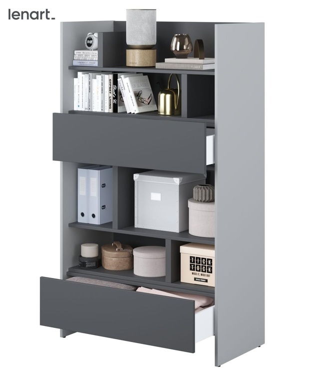 Regál se dvěma zásuvkami šedá/grafit. Rozměry viz obrázek. Nábytek je vyroben z kvalitního lamina s ABS hranou. Lamino je odolné proti poškrábání, poškození, vlhkosti a vysokým teplotám. Dodáváme v demontovaném stavu.CASA 73026