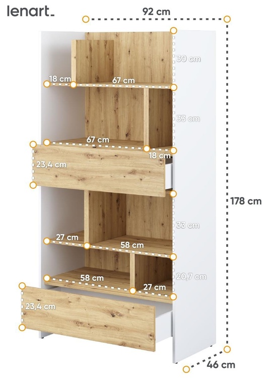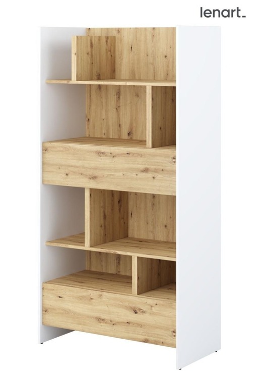 Regál se dvěma zásuvkami bílá/dub artisan. Rozměry viz obrázek. Nábytek je vyroben z kvalitního lamina s ABS hranou. Lamino je odolné proti poškrábání, poškození, vlhkosti a vysokým teplotám. Dodáváme v demontovaném stavu.CASA 73026