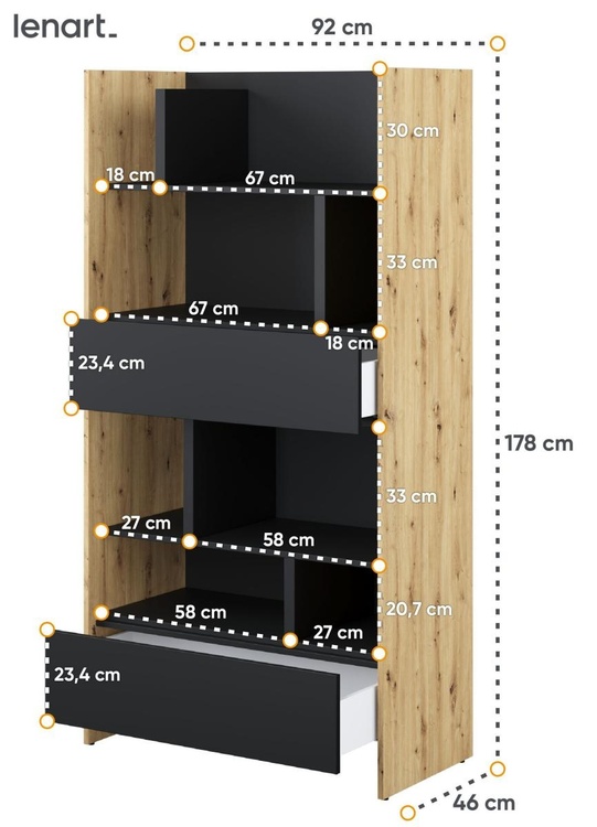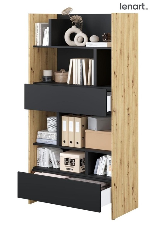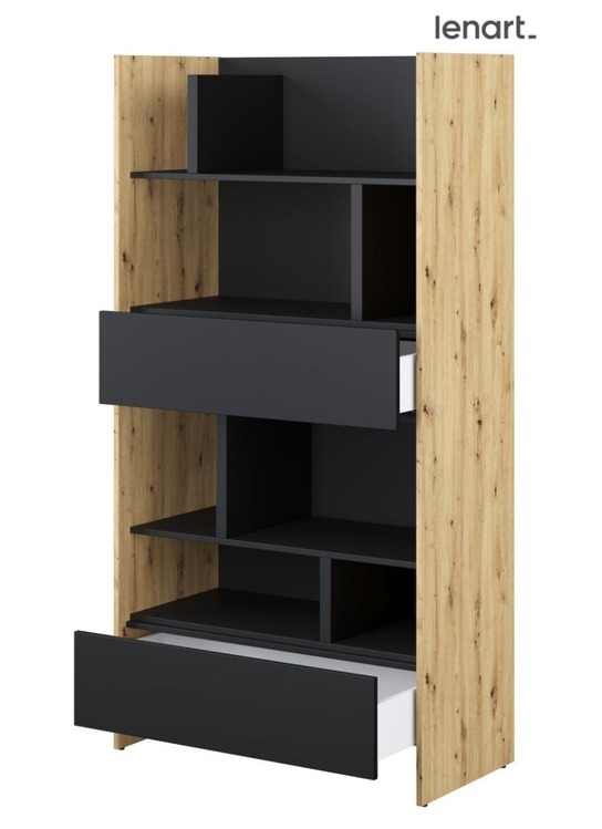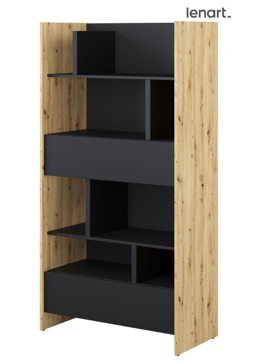 Regál se dvěma zásuvkami dub artisan/černá. Rozměry viz obrázek. Nábytek je vyroben z kvalitního lamina s ABS hranou. Lamino je odolné proti poškrábání, poškození, vlhkosti a vysokým teplotám. Dodáváme v demontovaném stavu.CASA 73026