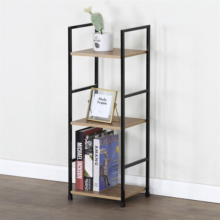 Odlehčený policový regál. Kostra vyrobena z kovových hranatých profilů černé barvy. Na police je použita MDF deska s povrchovou úpravou 3D folie v textuře dubu. Balení obsahuje sadu umožňující připevnění ke stěně.