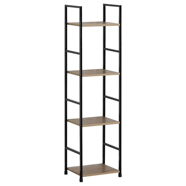 Odlehčený policový regál. Kostra vyrobena z kovových hranatých profilů černé barvy. Na police je použita MDF deska s povrchovou úpravou 3D folie v textuře dubu. Balení obsahuje sadu umožňující připevnění ke stěně.