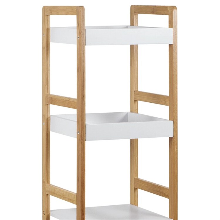 Regál s čtyřmi policemi kombinuje pevný rám z masivního bambusu v přírodním odstínu s policemi z MDF desek opatřených bílým matným lakem. Tento materiálový mix zajišťuje stabilitu a zároveň moderní vzhled vhodný do různých interiérů. Police jsou navrženy tak, aby unesly zatížení až 12 kg, což umožňuje bezpečné uložení dekorací, knih nebo drobných předmětů. Otevřená konstrukce regálu podporuje snadný přístup a přehlednost uložených věcí. Kompaktní rozměry a decentní barevné provedení umožňují univerzální využití v domácnostech i kancelářích.