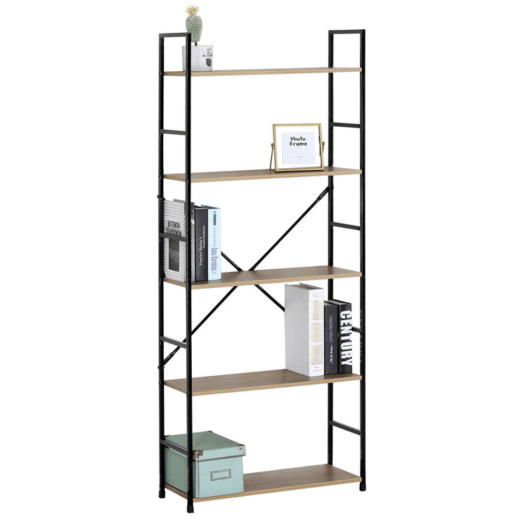 Odlehčený policový regál. Kostra vyrobena z kovových hranatých profilů černé barvy. Na police je použita MDF deska s povrchovou úpravou 3D folie v textuře dubu. Pro lepší stabilitu je na zadní straně kovová výztuha ve tvaru písmene X. Balení obsahuje sadu umožňující připevnění ke stěně.