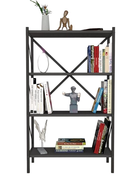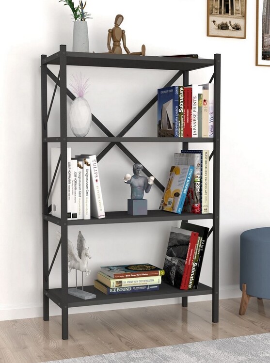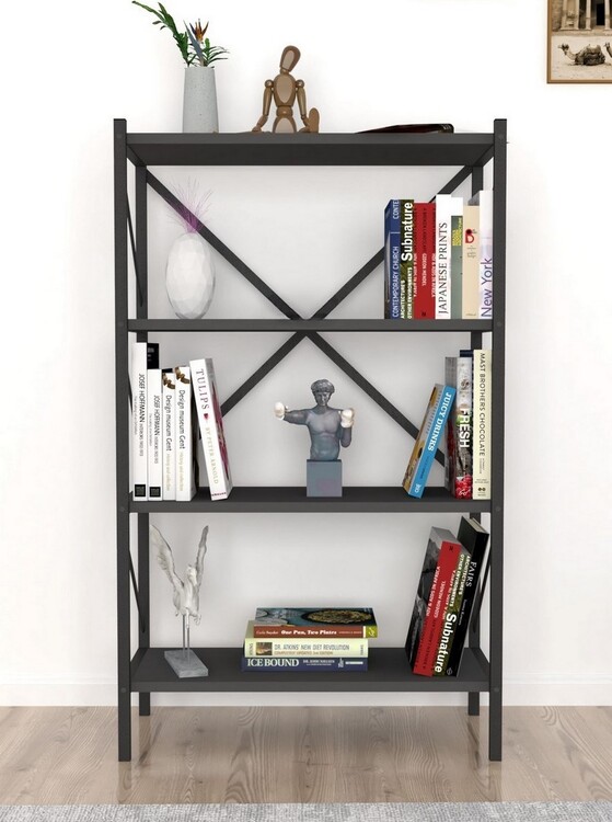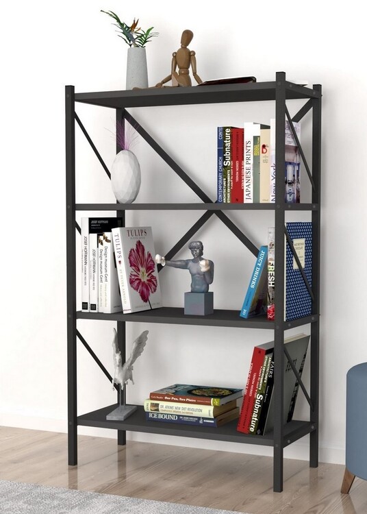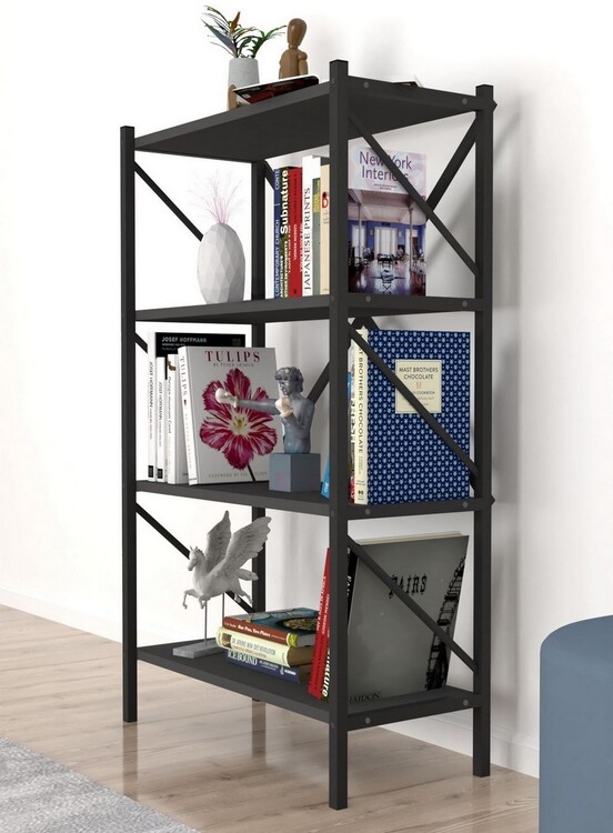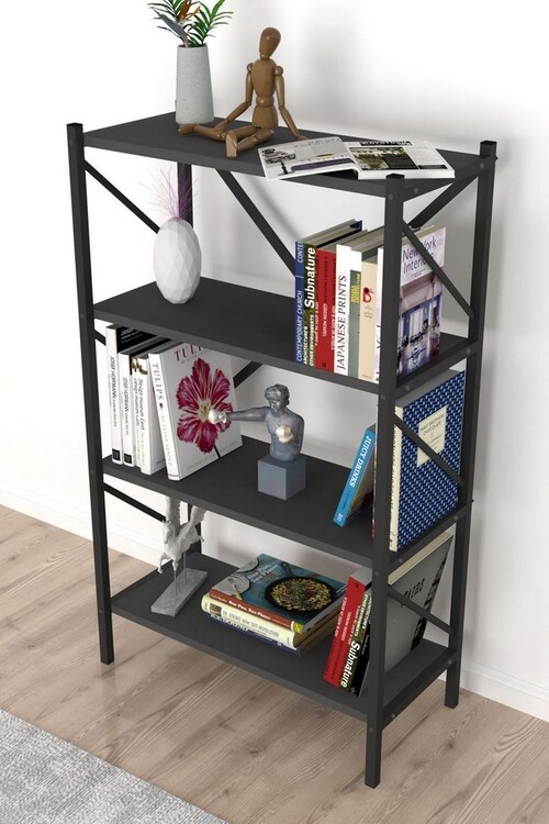 Regál se čtyřmi policemi je z kovového rámu v matné černé barvě a police jsou vyrobeny z kvalitní LTD desky. Barevné provedení polic je antracit. Dodáváme v demontovaném stavu.CASA 36006