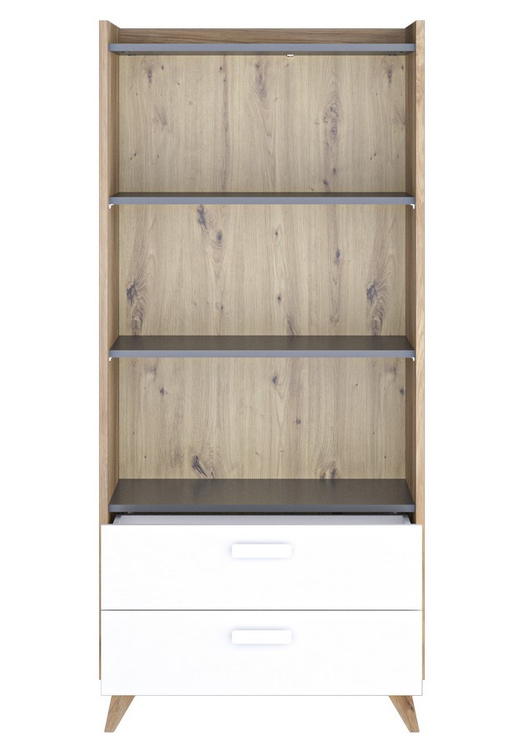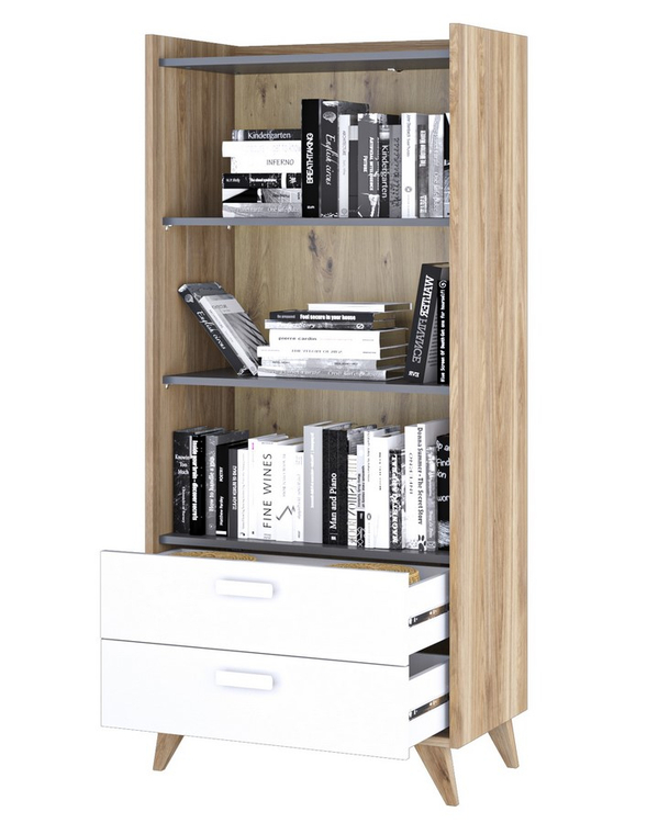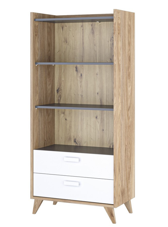 Regál se dvěma zásuvkami v moderním stylu a geometrických tvarech. Nábytek je vyroben z desky LTD hraněné páskou ABS, korpus je v barvě dub castello medový, zásuvky jsou v barvě bílá alpská, police jsou v šedé barvě. Zatížení polic max. 5 kg. Nožky mají netradiční zkosený tvar. Dodáváme v... více informací o zboží