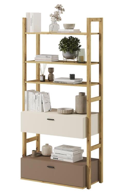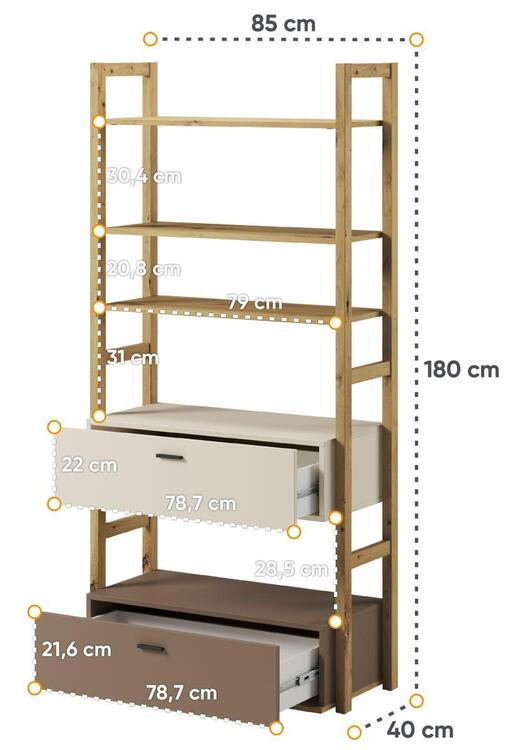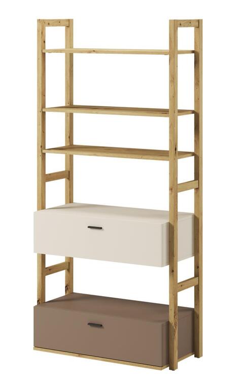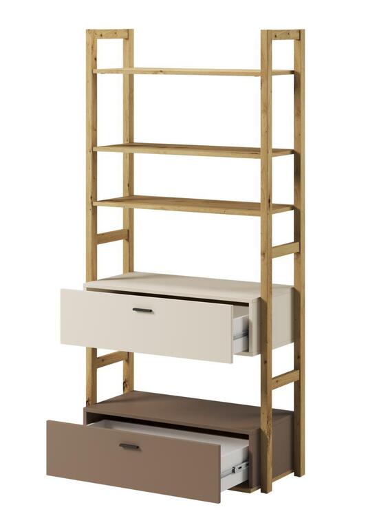 Regál se dvěmi zásuvkami a volným prostorem. Rozměry viz obrázek. Tento sektorový nábytek nejen pro teenagery působí nejen příjemně, ale má i svůj specifický charakter. Je vyroben z kvalitní LTD 16 mm hraněné ABS páskou, zadní strany nábytku a dna zásuvek jsou z HDF 3 mm, ůchyty jsou z plastu. Jemné spojení pískového béžového, lanýžového odstínu a dekoru v barvě dub artisan činí tuto kolekci nejen stylovou, ale také nadčasovou. Dodáváme v demontovaném sta­vu.