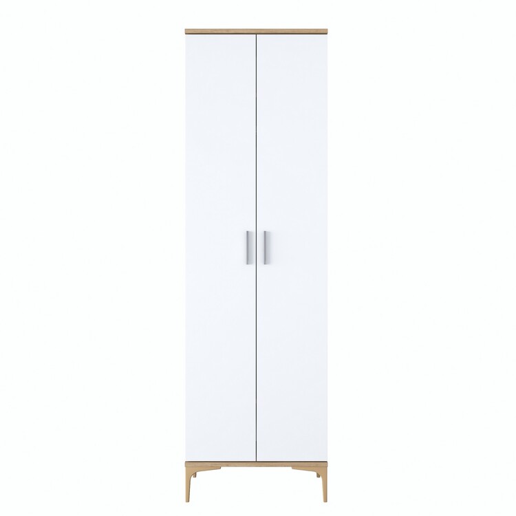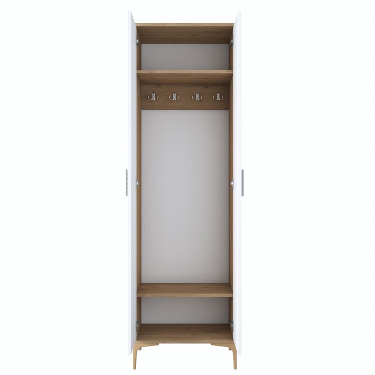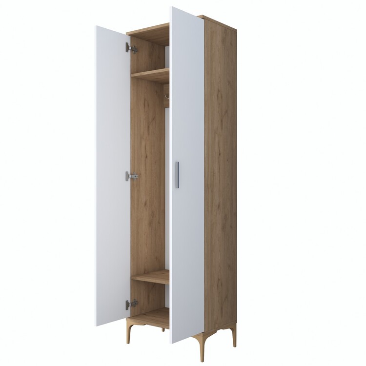 Skříň nabízí praktické řešení pro ukládání oblečení a doplňků. Díky plným dvířkům vše zůstane úhledně uschováno, zatímco vestavěné věšáky zajistí snadný přístup k vašim kabátům, bundám nebo dalším nezbytnostem.