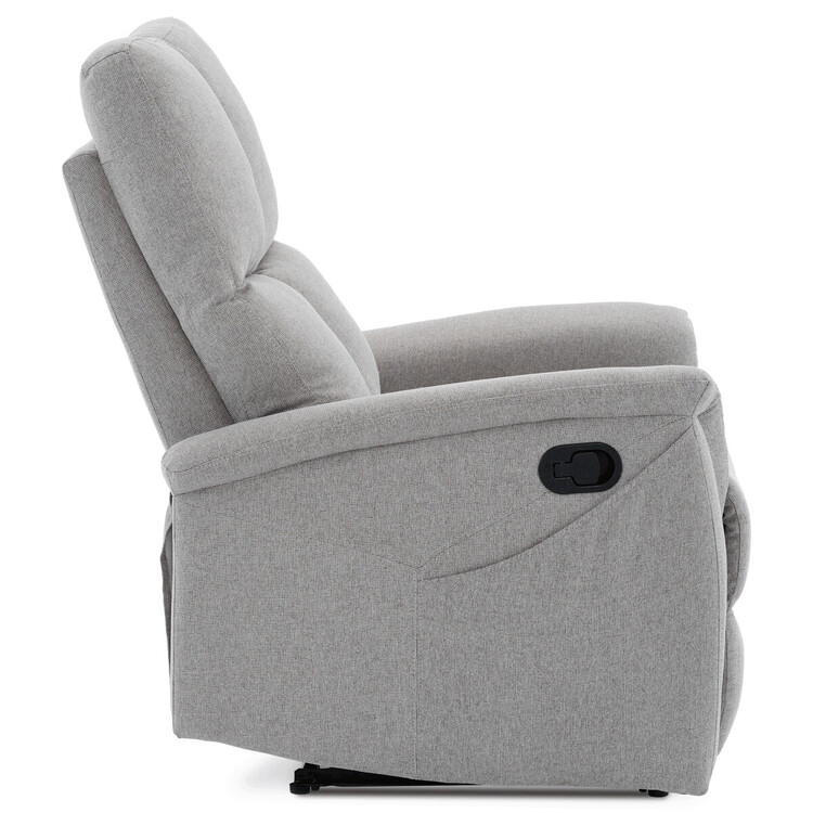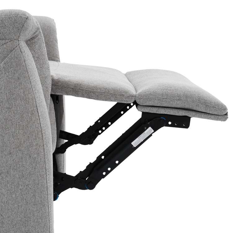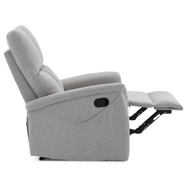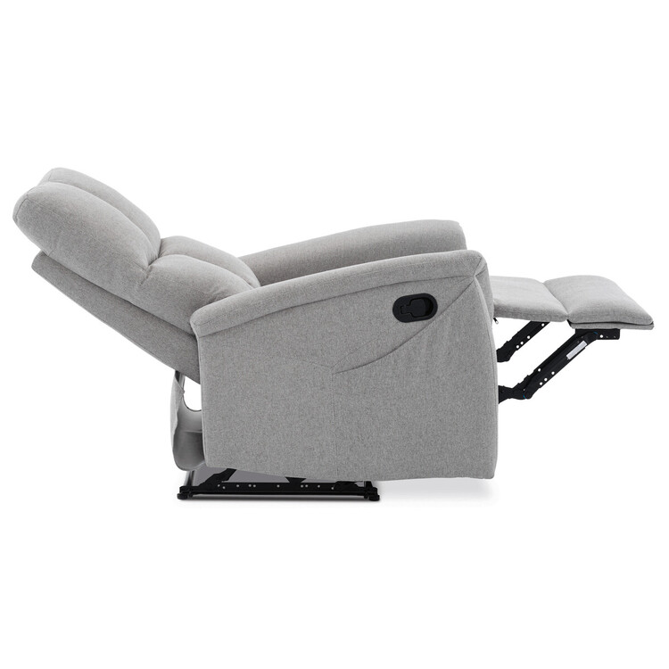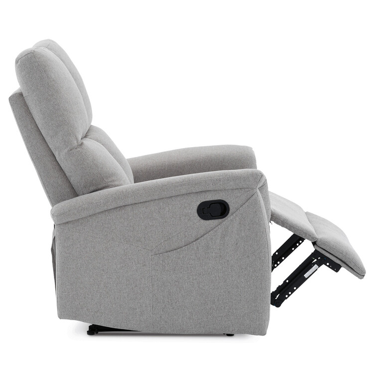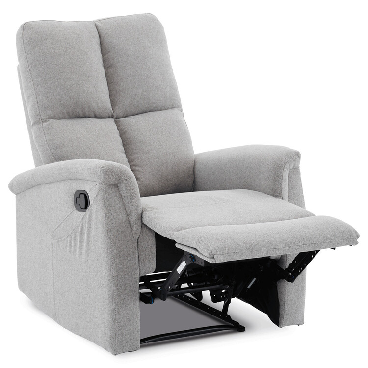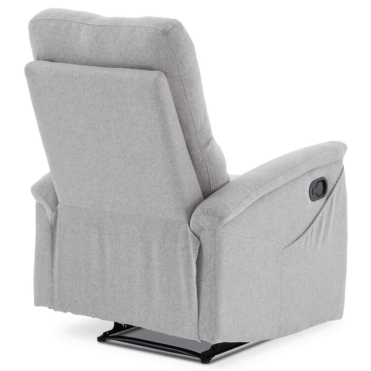 Polohovací křeslo, světle šedé barvy, s manuálním ovládáním. Toto komfortní křeslo je vybaveno postranní pákou, která umožňuje snadné zvednutí podnožky.Na boku křesla je praktická kapsa pro uložení drobností, jako jsou časopisy, dálkový ovladač nebo mobilní telefon. Křeslo je navrženo pro maximální pohodlí a ergonomii, poskytuje vynikající podporu zad a relaxaci.Ideální pro každodenní odpočinek doma.