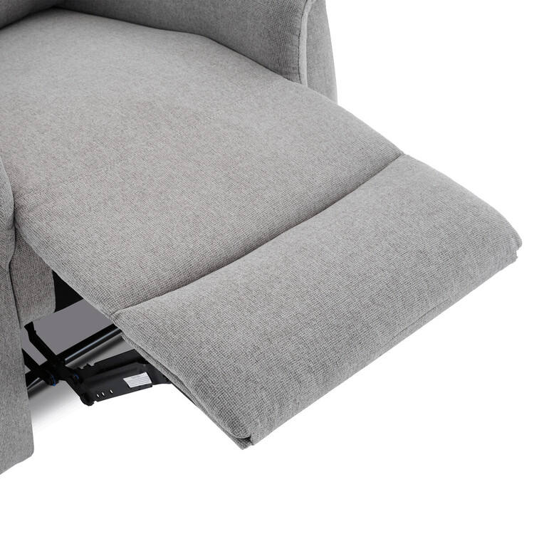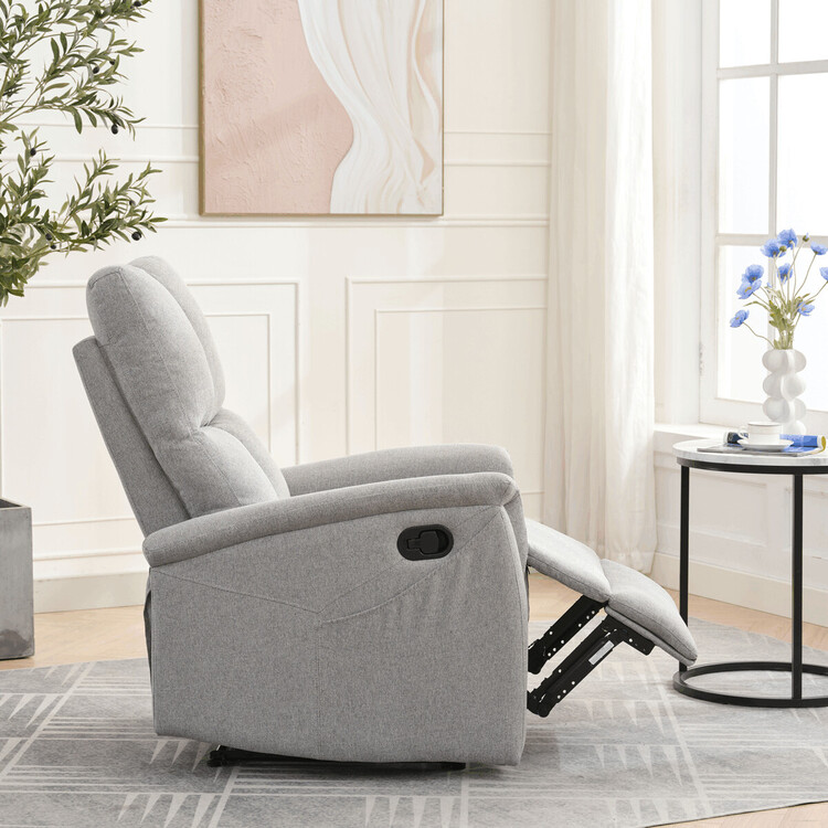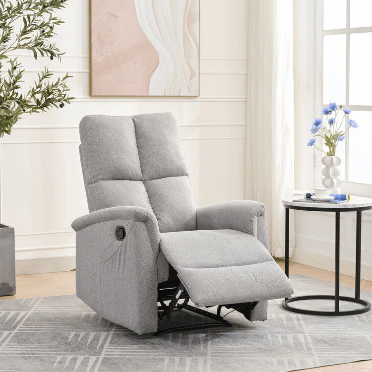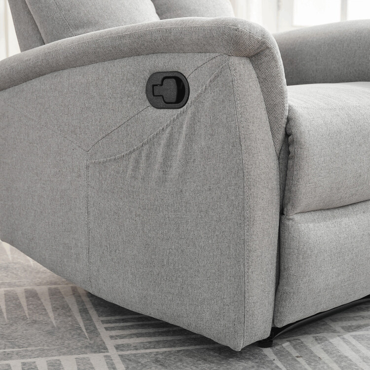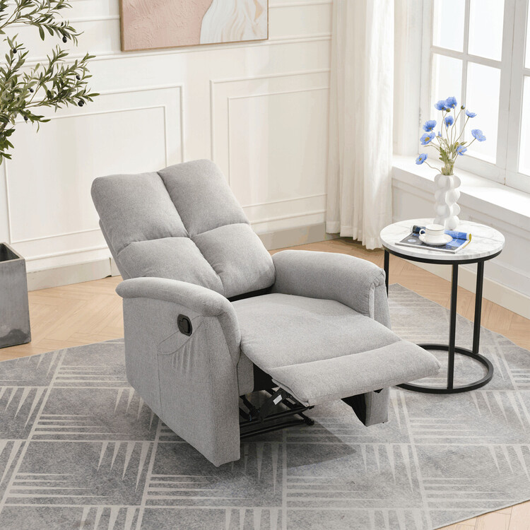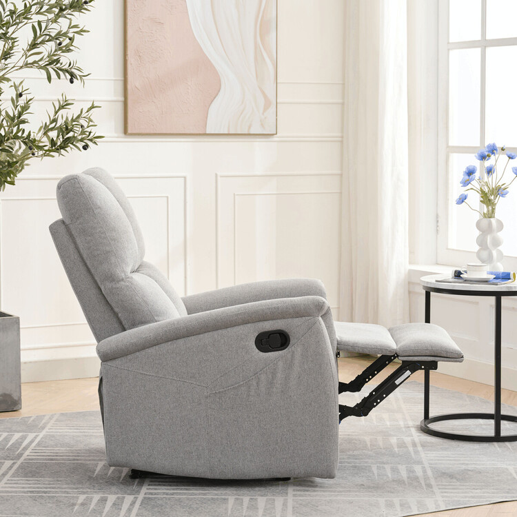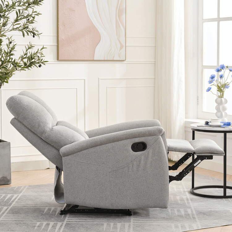 Polohovací křeslo, světle šedé barvy, s manuálním ovládáním. Toto komfortní křeslo je vybaveno postranní pákou, která umožňuje snadné zvednutí podnožky.Na boku křesla je praktická kapsa pro uložení drobností, jako jsou časopisy, dálkový ovladač nebo mobilní telefon. Křeslo je navrženo pro maximální pohodlí a ergonomii, poskytuje vynikající podporu zad a relaxaci.Ideální pro každodenní odpočinek doma.