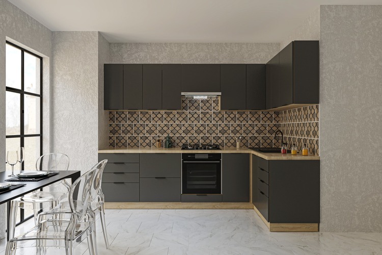 Rohová kuchyňská linka 280×140 v moderním stylu se spoustou úložného prostoru.Materiál LTD, korpus je v barvě dub Sonoma, dvířka a boční panely jsou v barvě grafit, úchyty jsou z kovu v barvě černé.