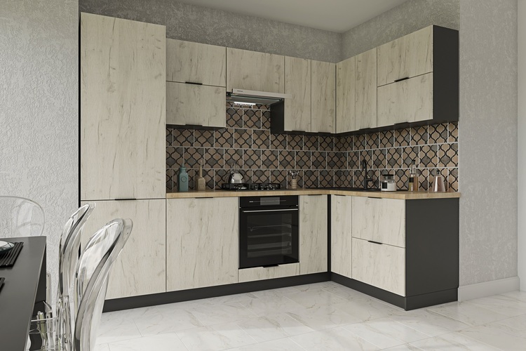 Rohová kuchyňská linka 280×160 v jednoduchém stylu.Materiál LTD, korpus je v barvě grafit, dvířka jsou v barvě bílý craft, úchyty jsou v černé barvě.