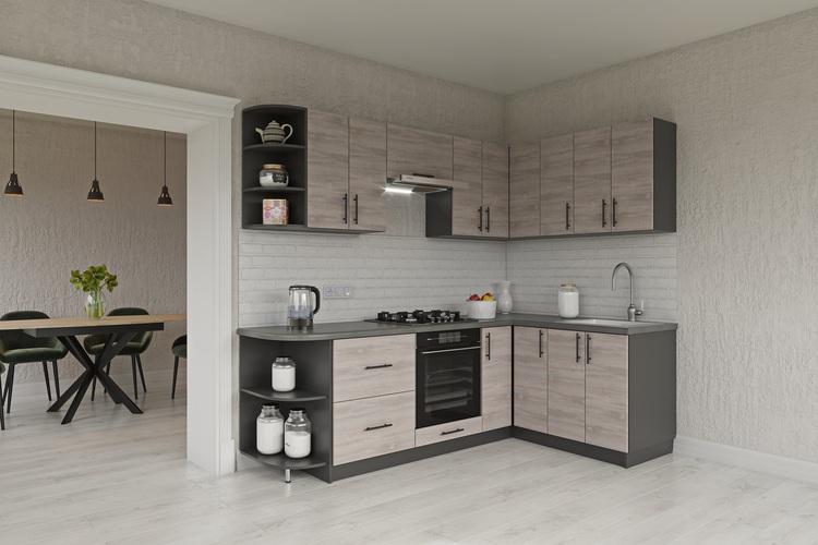 Rohová kuchyně 250×180 cm, vhodná do moderních interiérů.Materiál LTD, korpus je v barvě grafit, dvířka jsou v barvě dub club, úchyty jsou v černé barvě.