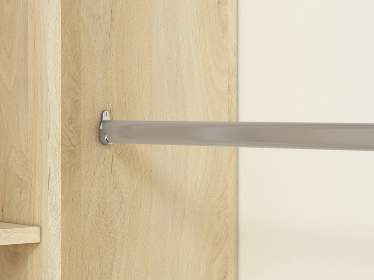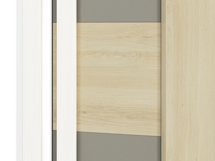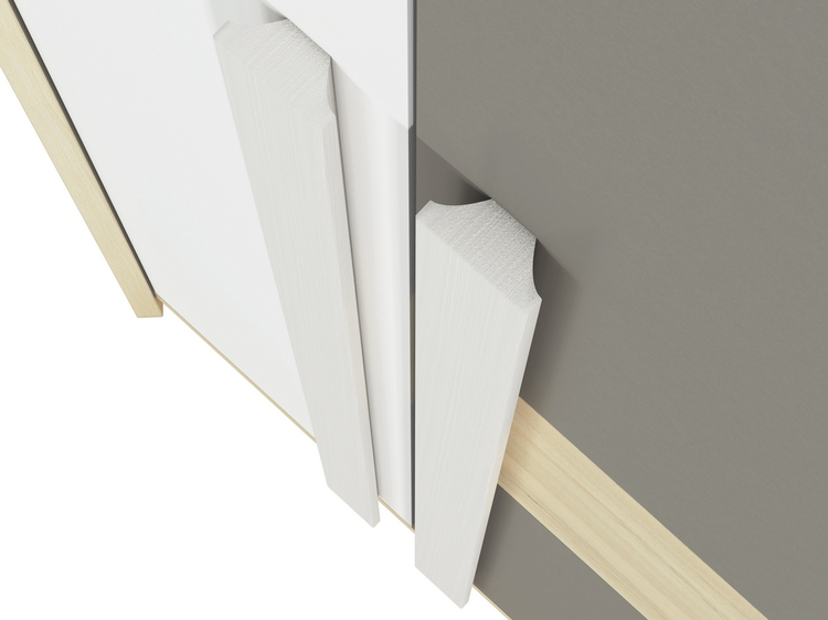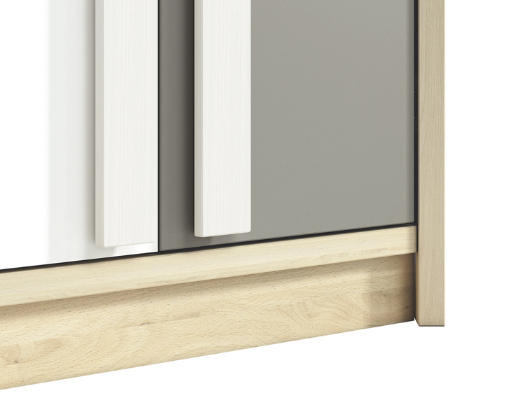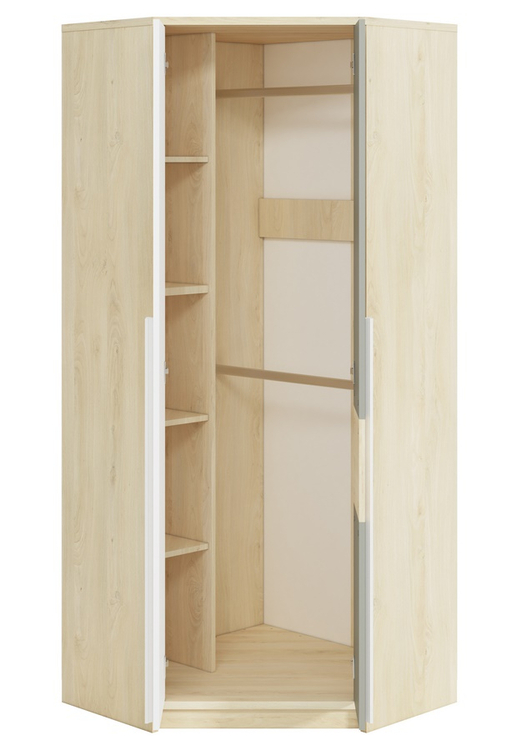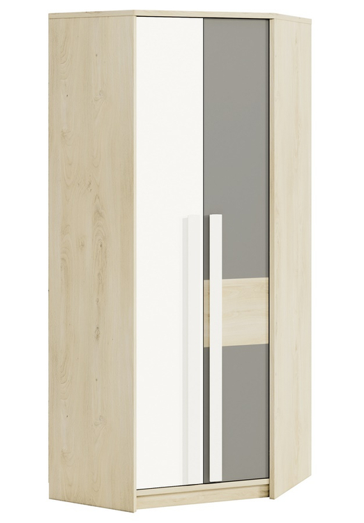 Rohová šatní skříň v moderním provedení. Korpus je vyroben z kvalitní desky LTD hraněné ABS páskou v barvě buk fjord, dvířka jsou vyrobeny z desky LTD v kombinaci barev buk fjord/bílá/šedá. V pravé části skříně jsou dvě šatní tyče nad sebou, levá část je vybavena policemi. Úchyty jsou dřevěné... více informací o zboží