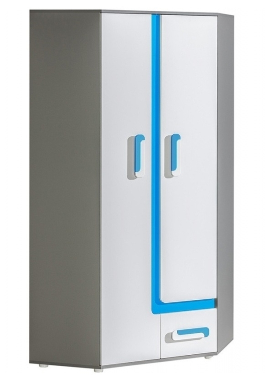 Šatní skříň rohová APETTITA ze sektorové řady, která se vyznačuje netradičním zpracováním barev a originalitou úchytů. Tento styl nábytku zaujme každou mladší generaci. Skříň je vyrobena z kvalitní LTD desky hraněné ABS lištou. Korpus je v barvě antracit, dveře jsou bílé matné, doplňková barva je tyrkys. Úchytky jsou v barevné kombinaci tyrkys/bílá. Uvnitř skříně je šatníková tyč a police, v dolní části je zásuvka. Sektorový nábytek APETTITA má široký výběr prvků, který Vám zaručí sestavit si dětský nebo studentský pokoj, ložnici či kancelář podle svých potřeb, přání a představ. Dodáváme v demontovaném stavu.CASA 23001