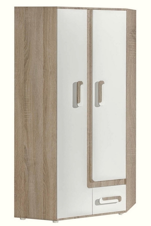 Šatní skříň rohová APETTITA ze sektorové řady, která se vyznačuje netradičním zpracováním barev a originalitou úchytů. Tento styl nábytku zaujme každou mladší generaci. Skříň je vyrobena z kvalitní LTD desky hraněné ABS lištou. Korpus je v barvě dub jasný, dveře jsou bílé matné. Úchytky jsou v barevné kombinaci dub jasný/bílá. Uvnitř skříně je šatníková tyč a police, v dolní části je zásuvka. Sektorový nábytek APETTITA má široký výběr prvků, který Vám zaručí sestavit si dětský nebo studentský pokoj, ložnici či kancelář podle svých potřeb, přání a představ. Dodáváme v demontovaném stavu.CASA 23001