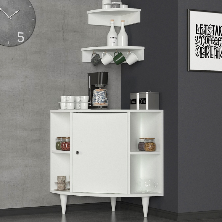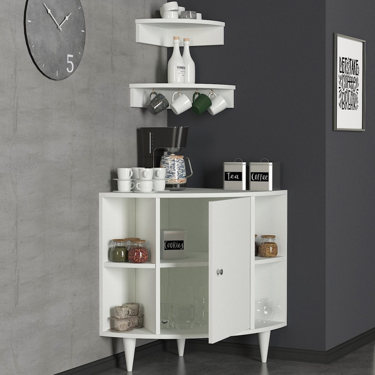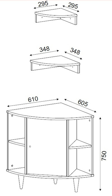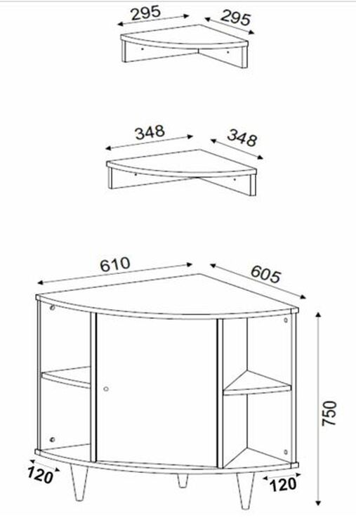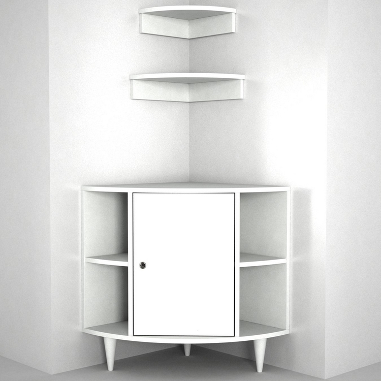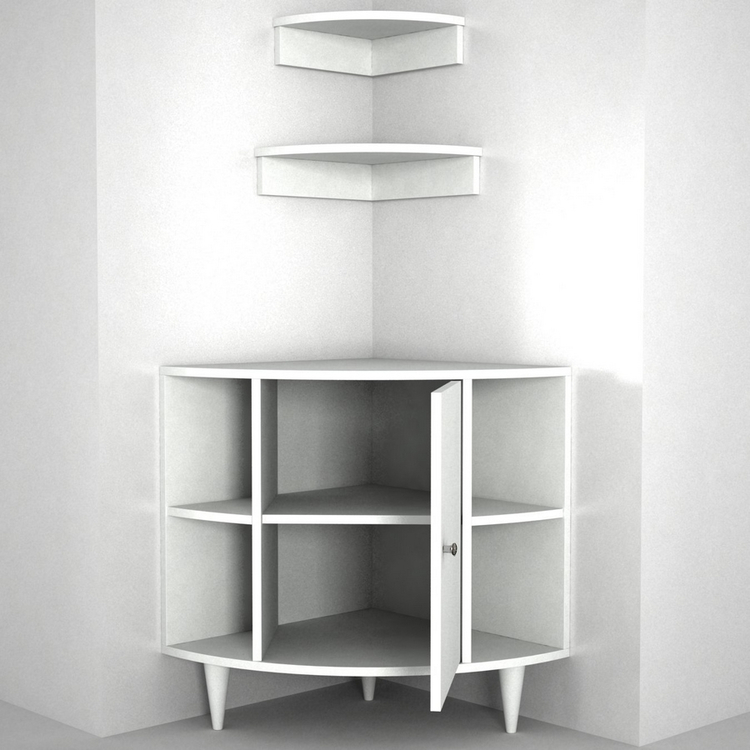 Rohová skříňka s policemi je vyrobena z kvalitního lamina o tl.18 mm hraněné PVC páskou, odolného proti poškrábání v barvě matná bílá. Závěsné rohové police mají rozměry (Š x V x H cm) 29,5 × 8,2 × 29,5 cm a 34,8 × 8,2 × 34,8 cm. Dodáváme v demontovaném stavu.CASA 28063