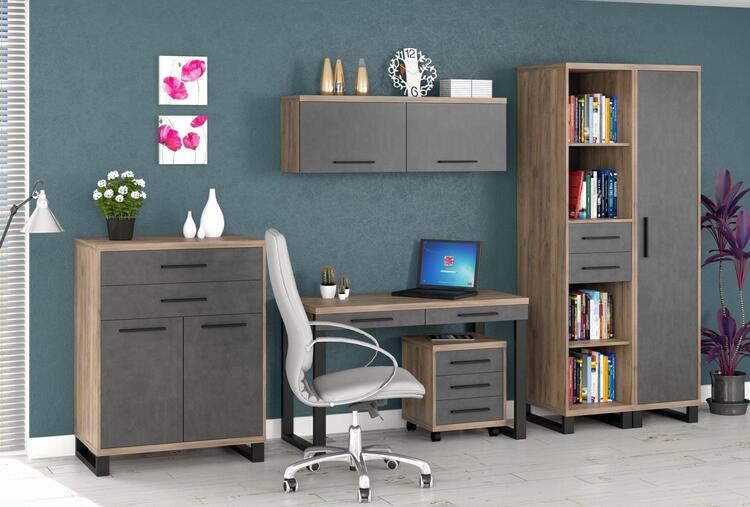 Rohový psací stůl v industriálním stylu je vyroben z kvalitní LTD v barevném provedení dub tabaco/matera. Součástí stolu je komoda se třemi zásuvkami, dvířky a policemi. Pevné kovové nohy podtrhují loftový ráz nábytku. Úchyty jsou kovové. V naší nabídce najdete široký výběr komponentů této kolekce, které si můžete dokoupit. Dodáváme v demontovaném stavu.CASA 97052